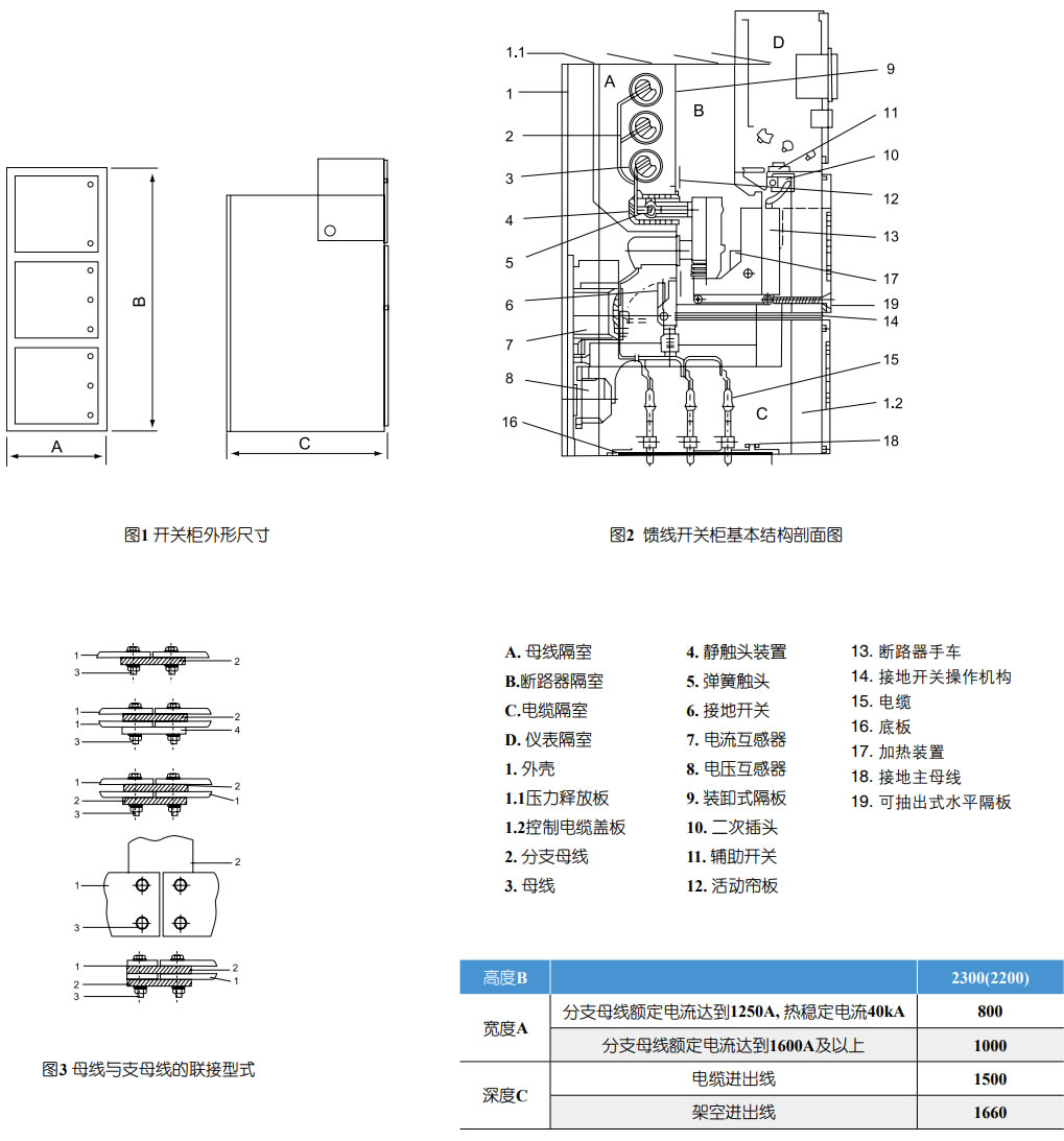 開關(guān)設(shè)備按GB3906-2006中的鎧裝金屬封閉開關(guān)設(shè)備而設(shè)計。開關(guān)柜結(jié)構(gòu)說明見圖1;開關(guān)柜由固定的柜體和可抽出部件(簡稱手車)兩大部分組成,柜體的外殼和各功能單元的隔板均采用螺栓聯(lián)接。開關(guān)柜外殼防護等級是IP4X,斷路器室開關(guān)柜結(jié)構(gòu)特點門打開時的防護等級為IP2X。開關(guān)柜可配用真空斷路器手車,也可配用固定式負荷開關(guān)。具有架空進(出)線、電纜出線及其它功能方案。開關(guān)柜可安裝成雙重柜排列,即安裝成背靠背或面對面雙排排列。